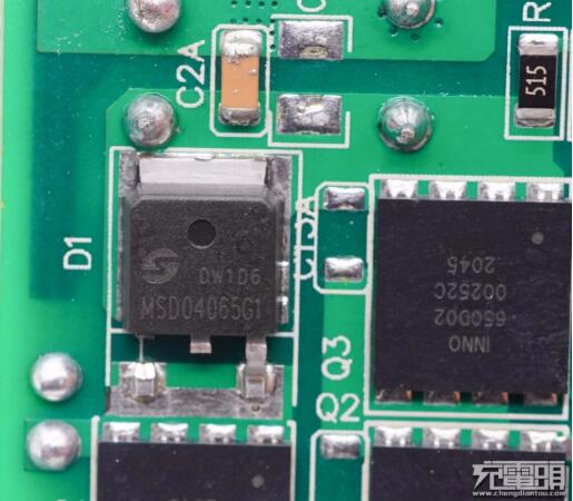 充電頭網(wǎng)通過拆解了解到,這款充電器內置PFC升壓電路,采用LLC+GaN高性能架構。PFC升壓部分采用恩智浦控制器,并選擇美浦森MSD04065G1碳化硅二極管以及英諾賽科INN650D2氮化鎵開關管進行整流。美浦森MSD04065G1是一顆650V耐壓的碳化硅肖特基二極管,TO252封裝。