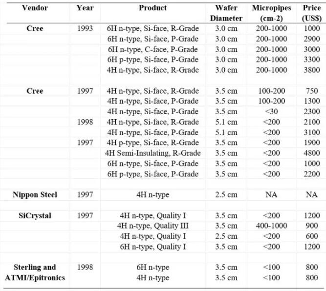 圖 2. 早期升華法碳化硅單晶供應(yīng)商和規(guī)格。