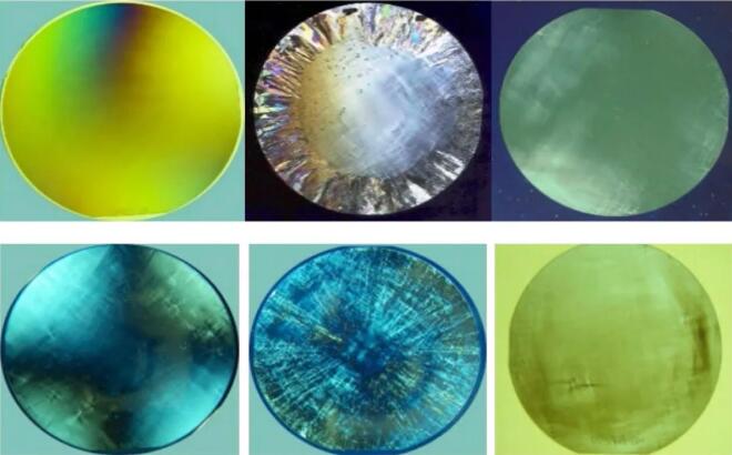 圖4.2002年左右,Cree 75mm、DOW 75mm和II-VI 50mm 4HN SiC (上)和半絕緣 SiC的交叉偏振圖像(下)。
