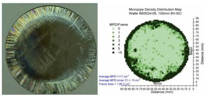 前兩份合同的主要目標是將4HN SiC的直徑擴大到100毫米。不過,當(dāng)時II-VI的100 mm半絕緣6H SiC邊緣區(qū)域布滿成形晶粒和其他缺陷,微管密度達到117cm-2(下圖)。