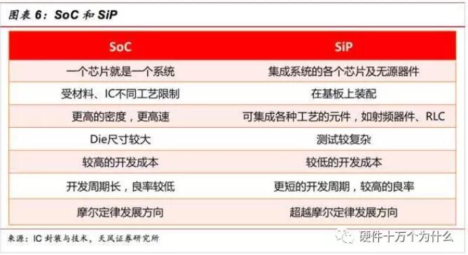 針對這兩條路徑,分別誕生了兩種產(chǎn)品:SoC與SiP。SoC是摩爾定律繼續(xù)往下走下的產(chǎn)物,而SiP則是實現(xiàn)超越摩爾定律的重要路徑。兩者都是實現(xiàn)在芯片層面上實現(xiàn)小型化和微型化系統(tǒng)的產(chǎn)物。