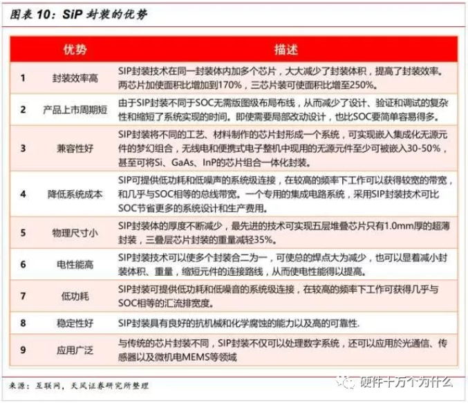 我們認(rèn)為,SiP不僅是簡單地將芯片集成在一起。SiP還具有開發(fā)周期短;功能更多;功耗更低,性能更優(yōu)良、成本價格更低,體積更小,質(zhì)量更輕等優(yōu)點,總結(jié)如下: