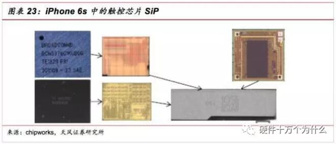 觸控芯片。在Iphone6中,觸控芯片有兩顆,分別由Broadcom和TI提供,而在6S中,將這兩顆封在了同一個package內(nèi),實現(xiàn)了SiP的封裝。而未來會進(jìn)一步將TDDI整個都封裝在一起。iPhone6s中展示了新一代的3D Touch技術(shù)。觸控感應(yīng)檢測可以穿透絕緣材料外殼,通過檢測人體手指帶來的電壓變化,判斷出人體手指的觸摸動作,從而實現(xiàn)不同的功能。而觸控芯片就是要采集接觸點的電壓值,將這些電極電壓信號經(jīng)過處理轉(zhuǎn)換成坐標(biāo)信號,并根據(jù)坐標(biāo)信號控制手機(jī)做出相應(yīng)功能的反應(yīng),從而實現(xiàn)其控制功能。3D Touch的出現(xiàn),對觸控模組的處理能力和性能提出了更高的要求,其復(fù)雜結(jié)構(gòu)要求觸控芯片采用SiP組裝,觸覺反饋功能加強(qiáng)其操作友好性。
