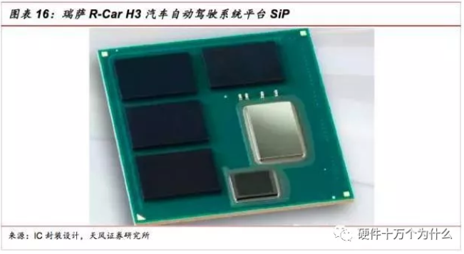 汽車電子是SiP的重要應(yīng)用場景。汽車電子里的SiP應(yīng)用正在逐漸增加。以發(fā)動機(jī)控制單元(ECU)舉例,ECU由微處理器(CPU)、存儲器(ROM、RAM)、輸入/輸出接口(I/O)、模數(shù)轉(zhuǎn)換器(A/D)以及整形、驅(qū)動等大規(guī)模集成電路組成。各類型的芯片之間工藝不同,目前較多采用SiP的方式將芯片整合在一起成為完整的控制系統(tǒng)。另外,汽車防抱死系統(tǒng)(ABS)、燃油噴射控制系統(tǒng)、安全氣囊電子系統(tǒng)、方向盤控制系統(tǒng)、輪胎低氣壓報警系統(tǒng)等各個單元,采用SiP的形式也在不斷增多。此外,SIP技術(shù)在快速增長的車載辦公系統(tǒng)和娛樂系統(tǒng)中也獲得了成功的應(yīng)用。