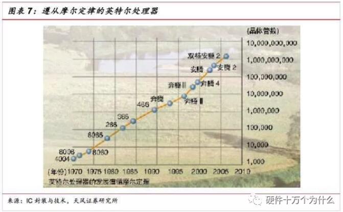 摩爾定律確保了芯片性能的不斷提升。眾所周知,摩爾定律是半導(dǎo)體行業(yè)發(fā)展的“圣經(jīng)”。在硅基半導(dǎo)體上,每18個月實現(xiàn)晶體管的特征尺寸縮小一半,性能提升一倍。在性能提升的同時,帶來成本的下降,這使得半導(dǎo)體廠商有足夠的動力去實現(xiàn)半導(dǎo)體特征尺寸的縮小。這其中,處理器芯片和存儲芯片是最遵從摩爾定律的兩類芯片。以Intel為例,每一代的產(chǎn)品完美地遵循摩爾定律。在芯片層面上,摩爾定律促進(jìn)了性能的不斷往前推進(jìn)。