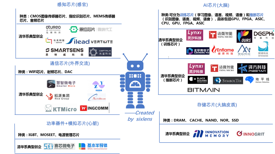 按照功能對芯片進(jìn)行分類,芯片可分為AI芯片、存儲(chǔ)芯片、感知芯片、通信芯片以及功率器件等。類比到人類的器官功能,AI芯片可類比為大腦,存儲(chǔ)芯片可類比為大腦皮質(zhì),感知芯片可類別為感官等。Sixlens數(shù)據(jù)顯示,清華系創(chuàng)企分布在芯片的各個(gè)領(lǐng)域,現(xiàn)分領(lǐng)域選取典型創(chuàng)企對其技術(shù)布局、投融資等情況進(jìn)行詳細(xì)說明,并洞察其所在行業(yè)概況。