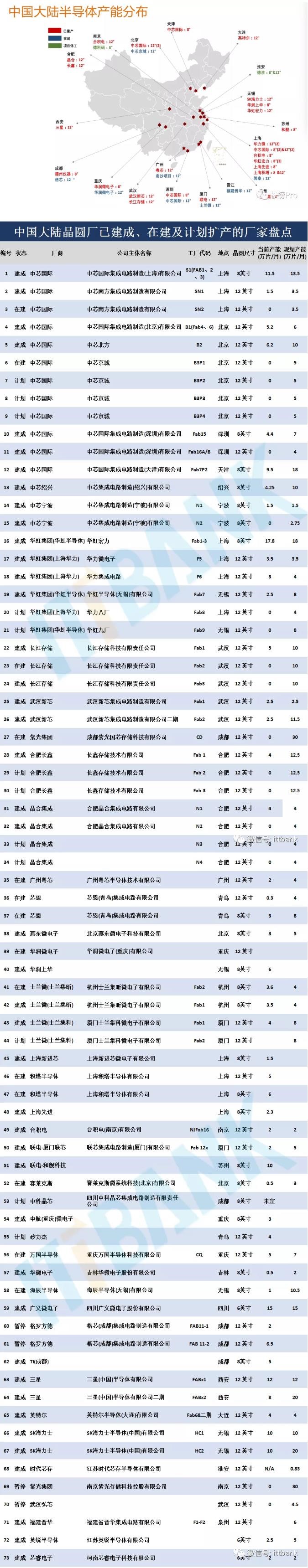 盤點中國大陸半導體產(chǎn)能分布、大陸73座晶圓廠狀態(tài)盤點。