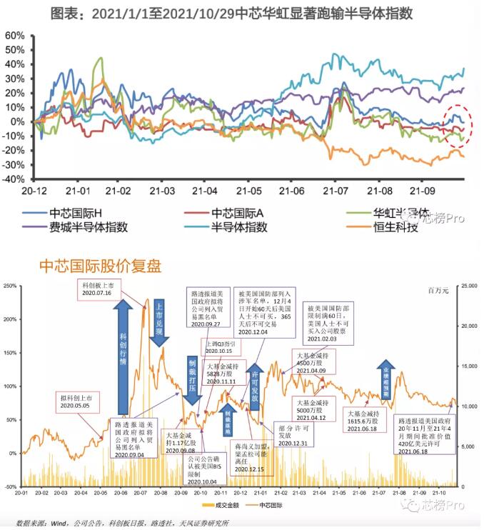 2021/1/1至2021/10/29,晶圓代工雙雄中芯國際和華虹半導體長期滯漲,中芯國際A股下跌4.69%,中芯國際港股下跌0.45%,華虹半導體下跌10.91%