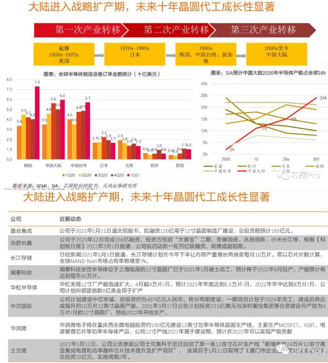 6、中芯國際公司計劃建設中芯京城,總投資約為497億元人民幣,將分兩期建設,一期項目計劃于2024年完工,建成后將達成每月約10萬片12英寸晶圓產(chǎn)能。2021年3月17日公告計劃投資23.5億美元與深圳重投集團等合資建設月產(chǎn)能為4萬片/月的12寸晶圓廠,預估2022年開始生產(chǎn)。