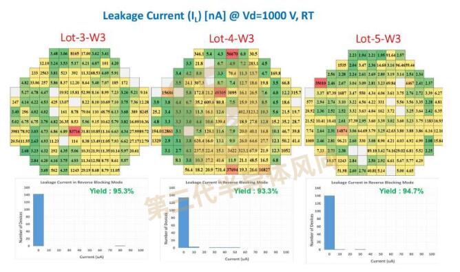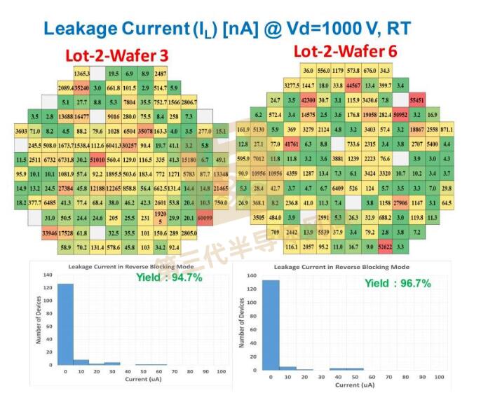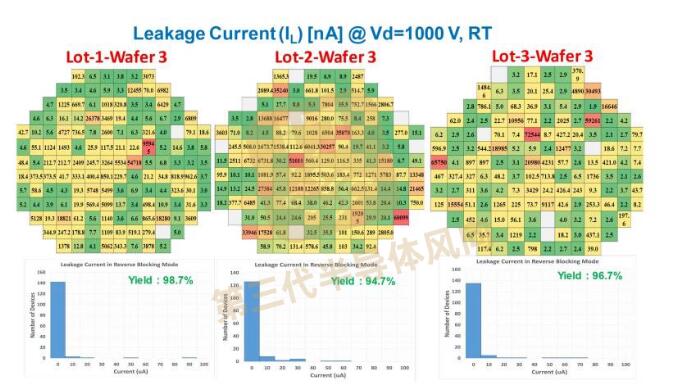 圖3. SiC JBS整流器在1000V反向偏置下測(cè)得的泄漏電流:晶圓內(nèi)和不同批次內(nèi)的晶圓間差異。