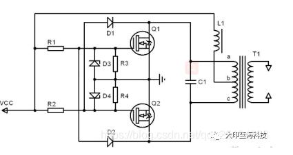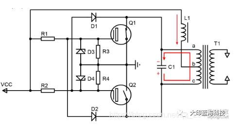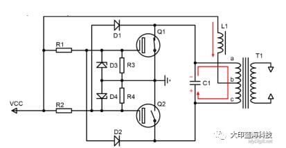 1.上電時L1通入的電流為零,電源通過R1、R2是Q1、Q2導通,L1電流逐漸增加,由于兩個開關(guān)管特性差異,將導致流入兩個開關(guān)管的電流不同,假設(shè)Q1電流大于Q2電流,所以Q1柵極電壓高于Q2柵極電壓,通過兩個二極管D1、D2,使得a點電壓低于c點電壓,故T1將產(chǎn)生b為正,a為負的感應(yīng)電壓,于是通過T1形成正反饋,使Q1導通,Q2截止。完成啟動過程。