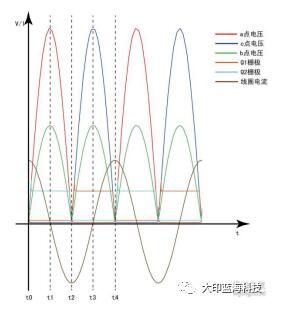5.(t2時間)當C1能力基本放完時,c點電壓下降到MOS管閥值電壓左右,將通過D2使Q1進入放大區(qū)。此時C1對T1繞組由c到a放電電流達到[敏感詞]值。同時由于Q1進入放大區(qū),a點電壓逐漸上升,同時通過D1使Q2也進入放大區(qū)。