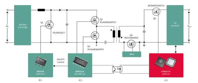 完整的解決方案如圖3所示。PFC級采用臨界導通模式IRS2505和ThinPAK封裝IPL60R185C7 CoolMOS?,而DC-DC級則采用數(shù)字PWM控制器XDPS2201和IPLK60R360PFD7。同時,BSC028N06NS用作同步整流開關(guān)(將來可以換成專門針對充電器同步整流用的低壓ISZ0702NLS以進一步提升性價比),協(xié)議控制器為CYPD3174,而p-channel MOS BSZ086N03NS3用作輸出安全開關(guān)。