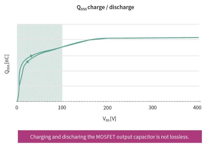 軟開關(guān)技術(shù)使器件能夠在ZVS下運行,即MOSFET僅在其漏源電壓達到0V(或接近于0V)后才導通。這種策略可以消除器件的導通損耗,而導通損耗通常是造成總開關(guān)損耗的主要因素。遺憾的是,由于輸出電容的“非無損”特性,所有高壓SJ MOSFET都會遭受另外一種損耗,即在MOSFET輸出電容(Coss)先充電后放電時,都會有部分能量損失。因此,即使在ZVS條件下運行,也無法回收存儲于輸出電容中的全部能量(Eoss)。這種現(xiàn)象與Coss的滯回特性有關(guān),在執(zhí)行Coss充電/放電周期時可以借助較大的信號測量觀察到這種現(xiàn)象。正因如此,此類損耗通常被稱為Coss滯回損耗(Eoss,hys)。