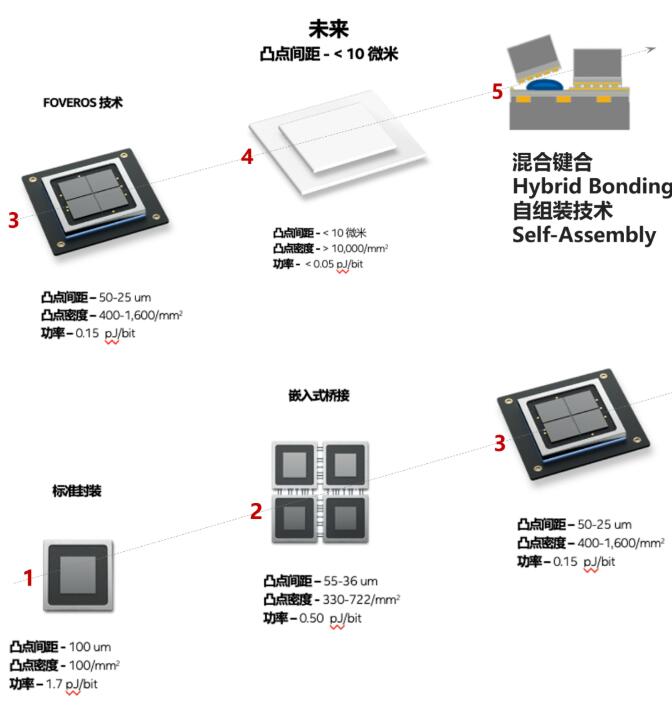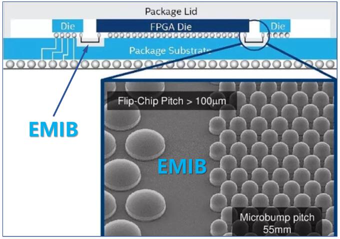 從標(biāo)準(zhǔn)封裝,到嵌入式多芯片互聯(lián)橋EMIB,更多的芯片被包含到封裝中,凸點(diǎn)間距也越來(lái)越小,從100um變?yōu)?5-36um。