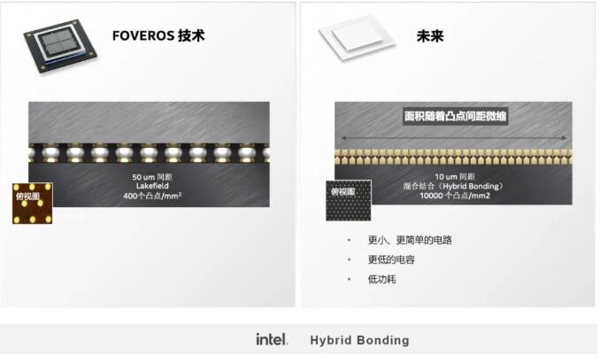 在今年 ECTC 上 Intel 發(fā)表了一篇關(guān)于混合鍵合技術(shù)的論文,這是一種在相互堆疊的芯片之間獲得更密集互連的方法,并可實(shí)現(xiàn)更小的外形尺寸。下圖左邊的技術(shù),被稱為 Foveros,凸點(diǎn)間距是 50 微米,每平方毫米有大約 400 個(gè)凸點(diǎn)。對(duì)于未來(lái), Intel 要做的是縮減到大約 10 微米的凸點(diǎn)間距,并達(dá)到每平方毫米 10,000 個(gè)凸點(diǎn)。
