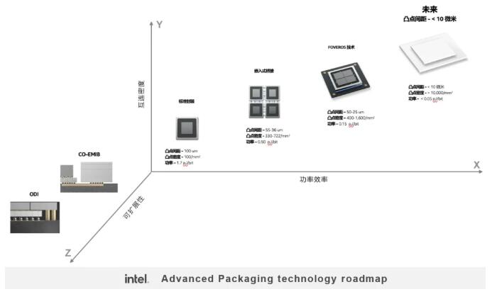 好的 ,我首先給大家分享 Intel 先進(jìn)封裝技術(shù)路線圖,圖中 X 軸代表功率效率, Y 軸代表互連密度,Z 軸則展示了我們的技術(shù)可擴(kuò)展性。