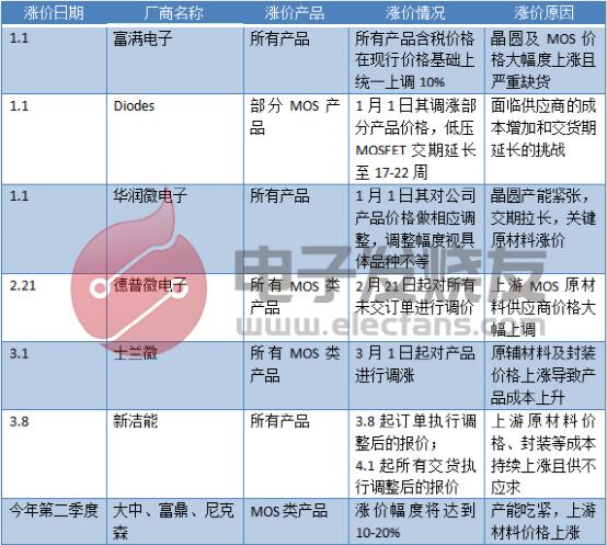 從市場(chǎng)上來(lái)看,MOSFET從2020年下半年開始,便已經(jīng)經(jīng)歷了多次提價(jià),如富滿電子、金譽(yù)半導(dǎo)體等,都已經(jīng)公開發(fā)布了調(diào)價(jià)聲明。近期的也有新潔能,宣布在3月8日其訂單執(zhí)行調(diào)整后的報(bào)價(jià),4月1日其所有交貨執(zhí)行調(diào)整后的報(bào)價(jià)。