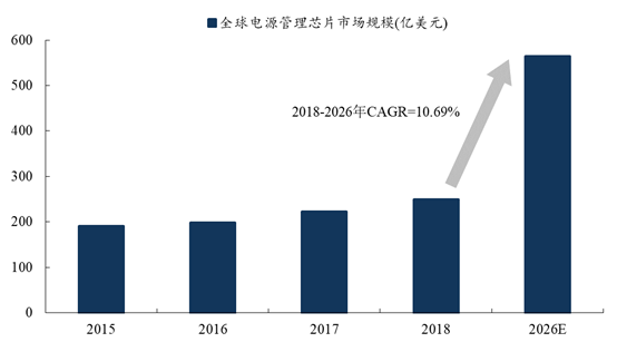 根據(jù)前瞻產(chǎn)業(yè)研究院的統(tǒng)計(jì)和預(yù)測(cè),全球電源管理芯片市場(chǎng)規(guī)模從2015年的191億美元增長(zhǎng)到2018年的250億美元。2019年仍保持著高速增長(zhǎng),其中以中國(guó)大陸為主的亞太地區(qū)是未來(lái)[敏感詞]增長(zhǎng)區(qū)域市場(chǎng)。預(yù)計(jì)到2026年全球市場(chǎng)規(guī)模將達(dá)到565億美元,2018-2026 期間年復(fù)合增長(zhǎng)率(CAGR)為10.69%。