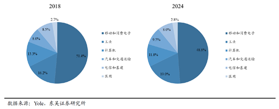 根據(jù)Yole的統(tǒng)計(jì),預(yù)計(jì)2018-2024年期間,移動(dòng)通信和消費(fèi)電子應(yīng)用在全球電源管理芯片市場(chǎng)的占比將由51.4%降為48.8%,但仍是電源管理芯片的[敏感詞]細(xì)分市場(chǎng)。此外,工業(yè)和計(jì)算機(jī)也是電源管理芯片的主要細(xì)分應(yīng)用領(lǐng)域。