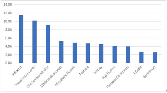 2019全球年功率半導(dǎo)體市場(chǎng)的主要廠商及市場(chǎng)份額如下: