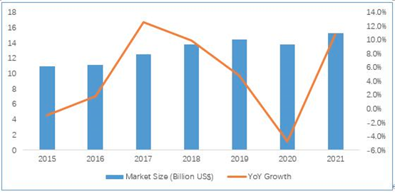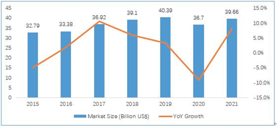 2019年中國(guó)的功率半導(dǎo)體市場(chǎng)約144.8億美元,占全球功率半導(dǎo)體市場(chǎng)的35.9%。2020年將出現(xiàn)負(fù)增長(zhǎng),下降到138億美元。預(yù)期2021年恢復(fù)增長(zhǎng),增長(zhǎng)率超過(guò)10%。