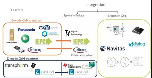 氮化鎵(GaN)器件可分為分離器件和集成器件兩大類,其中分離器件主要包括增強(qiáng)模式(E-Mode) GaN晶體管和耗盡模式(D-Mode) GaN晶體管,代表廠商包括松下、EPC、英飛凌、安森美、GaN系統(tǒng)和Transphorm等。集成器件又分為系統(tǒng)級(jí)封裝集成和系統(tǒng)級(jí)芯片集成,代表廠商包括TI、EPC、英飛凌、納微(Navitas)、Power Integrations(PI)和dialog等。