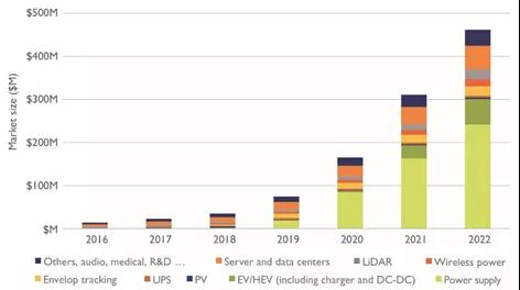 根據(jù)Yole對(duì)GaN應(yīng)用的細(xì)分市場(chǎng)預(yù)測(cè),從2019年開(kāi)始,GaN在電源應(yīng)用領(lǐng)域開(kāi)始快速增長(zhǎng),預(yù)計(jì)到2022年將超過(guò)2億美元,其中移動(dòng)設(shè)備快充充電器是其主要驅(qū)動(dòng)力。
