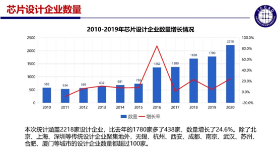 在山城重慶舉辦的2020年ICCAD上,中國半導(dǎo)體行業(yè)協(xié)會IC設(shè)計(jì)分會理事長魏少軍教授的重量級報(bào)告呈現(xiàn)出了在新常態(tài)下中國IC設(shè)計(jì)業(yè)的現(xiàn)狀:2020年中國本土IC設(shè)計(jì)公司達(dá)到了2218家,較2019年增加了438家,銷售額增長23.9%,較2019年提升4.1%;布局也在發(fā)生變化,除北京、上海、深圳等傳統(tǒng)集成電路設(shè)計(jì)企業(yè)聚集地外,無錫、杭州、西安、成都、南京、武漢、蘇州、合肥、廈門等城市的設(shè)計(jì)類企業(yè)數(shù)量都超過了100家。同時(shí),中國開始進(jìn)入以CPU為代表的高端芯片領(lǐng)域。盡管差距仍在,但國產(chǎn)CPU由專用領(lǐng)域轉(zhuǎn)向公開市場領(lǐng)域,是具里程碑意義的重要一步。