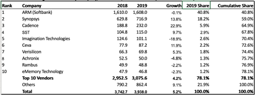 根據(jù)市場分析公司IPnest發(fā)布的2019年全球半導(dǎo)體IP廠商的營收排名,目前全球主要IP 供應(yīng)商包括Arm、Synopsys、Cadence、SST、Imagination Technologies、CEVA、VeriSilicon、Achronix、Rambus和eMemory。