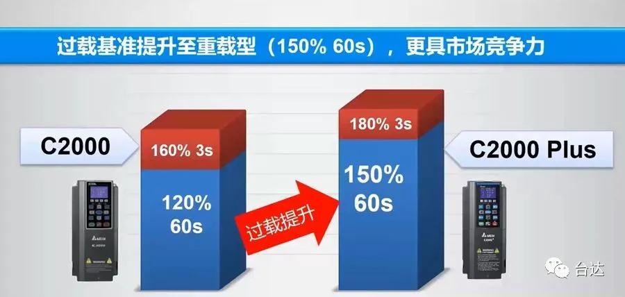 過載能力的大幅強(qiáng)化,是C2000+最關(guān)鍵的性能提升之一。也這是標(biāo)準(zhǔn)型變頻器在市場(chǎng)應(yīng)用中最被關(guān)注的指標(biāo)之一。原本臺(tái)達(dá)C2000可實(shí)現(xiàn)標(biāo)準(zhǔn)模式下負(fù)載120% 60秒,負(fù)載150%3秒;重載模式下可負(fù)載150%60秒,負(fù)載180%3秒。這已經(jīng)超出了歐美主流泛用型變頻器的性能。不過,在實(shí)際操作中仍然會(huì)有一些應(yīng)用場(chǎng)景需要放大一檔選型。