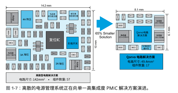 因?yàn)楫?dāng)前的幾種趨勢(shì),PMIC 市場(chǎng)正在飛速發(fā)展。一種趨勢(shì)是消費(fèi)者對(duì)無線移動(dòng)的追逐,帶來了對(duì)于小型、電池驅(qū)動(dòng)設(shè)備的大量需求,隨之則需要更多高集成度電源管理解決方案,如圖 1-7 所示。該圖顯示了 Qorvo 的PMIC 解決方案如何大幅度降低組件數(shù)量和方案的整體大小。