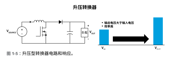這里 Buck 的意思是“降低”或“減弱”。降壓轉(zhuǎn)換器是一個(gè)減弱型轉(zhuǎn)換穩(wěn)壓器,可以高效輸出低于 VIN 的 VOUT。降壓型電路包含電感、開關(guān)場(chǎng)效應(yīng)晶體管(FET)或二極管、電容以及具有開關(guān)控制電路的誤差放大器(如圖 1-4 所示)。降壓轉(zhuǎn)換器會(huì)改變金屬氧化物半導(dǎo)體場(chǎng)效應(yīng)晶體管(MOSFET)的開啟時(shí)間,然后把電能應(yīng)用到感應(yīng)器上。降壓轉(zhuǎn)換器有很高的效率,因?yàn)?MOSFET 或者完全開啟,或者完全關(guān)閉。在開和關(guān)(阻抗)兩種狀態(tài)之間,降壓轉(zhuǎn)換器不工作,這一點(diǎn)與線性穩(wěn)壓器不同。