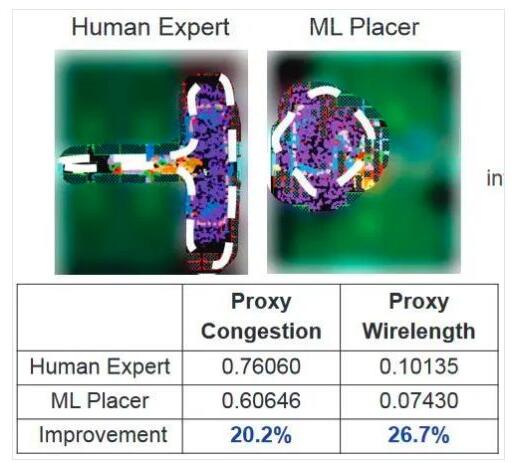 人類ASIC專家的布局布線結果和一個低功耗ML加速器芯片的布局布線結果對比。谷歌故意遮蓋了部分圖像。(來源:Google Research / ISSCC)