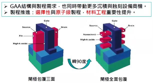 由于新的結(jié)構(gòu)所需的生產(chǎn)工藝與鰭式晶體管相似,關(guān)鍵工藝步驟幾乎一樣,可以繼續(xù)使用現(xiàn)有的設(shè)備以及技術(shù)成果,對臺積電和三星而言,這無疑是代價[敏感詞]的技術(shù)路線更換方案。但GAA對加工精度要求進一步提高,需要區(qū)域選擇性沉積技術(shù)與原子級加工能力,因而材料工程重要性提升,也將帶動更多沉積與蝕刻設(shè)備商機。