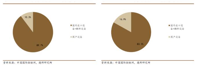 根據(jù)《中國制造2025》目標(biāo),2020年半導(dǎo)體核心基礎(chǔ)零部件、關(guān)鍵基礎(chǔ)材料應(yīng)實現(xiàn)40%的自主率,2025年要達到70%國產(chǎn)化率。但根據(jù)長江存儲、華力微電子等國內(nèi)十家晶圓制造企業(yè)2017年至2021年一季度的公開招標(biāo)信息來看,國產(chǎn)化率距離目標(biāo)還很遠。2017至2019年,這十家廠商合計開標(biāo)4197臺設(shè)備,其中國產(chǎn)設(shè)備為431臺,國產(chǎn)化率約為10.3%;而2020年至2021年一季度這十家晶圓廠合計開標(biāo)1862臺設(shè)備,其中國產(chǎn)設(shè)備達315臺,推算目前國產(chǎn)化率在17%,較2017至2019年增長超過6個百分點。
