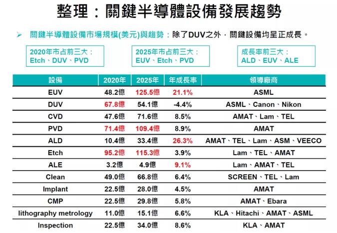 根據(jù)臺灣工研院的估計,全球關(guān)鍵半導(dǎo)體設(shè)備在今后幾年成長勢頭都非常好,除了DUV(深紫外)光刻設(shè)備,其余設(shè)備均呈正增長態(tài)勢。其中ALD(原子層沉積)增長率[敏感詞],預(yù)計2020年至2025年期間,年均增長率達到26.3%,EUV設(shè)備增長率排名第二,年均增長率也達兩位數(shù)。而以金額計EUV設(shè)備則獨占鰲頭,預(yù)計2025年EUV設(shè)備銷售額達到125.5億美元,超過蝕刻機,成為各細分方向銷售額[敏感詞]的半導(dǎo)體設(shè)備。