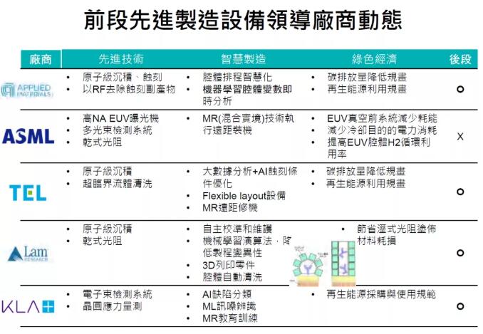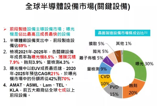 雖然2020年全球超過8成設(shè)備銷往東亞地區(qū),但除了日本,中(大陸加臺灣)韓在設(shè)備業(yè)上影響力都不大。全球前五大半導(dǎo)體前道(即晶圓制造,封裝為后道)設(shè)備廠商應(yīng)用材料(AMAT)、阿斯麥(ASML)、泛林(Lam)、東京電子(TEL)和科磊(KLA)占據(jù)市場份額超過七成,其中只有東京電子總部在東亞,其余都是美歐企業(yè)。