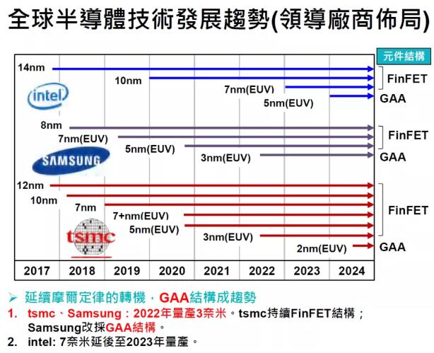 在28納米之后,平面晶體管工藝達到極限,F(xiàn)inFET(鰭式晶體管)延續(xù)了摩爾定律,將工藝節(jié)點推進到現(xiàn)在的10納米以下。不過FinFET路線也已經(jīng)接近極限,三星將在3納米工藝上率先采用GAA(全環(huán)繞柵極)結(jié)構(gòu),臺積電則在3納米節(jié)點繼續(xù)FinFET結(jié)構(gòu),到2納米節(jié)點再采用GAA結(jié)構(gòu)。臺灣工研院認為,英特爾在晶圓制造上遇到了麻煩,7納米工藝(注:三家對工藝尺寸定義各有區(qū)別,不適合直接拿數(shù)字對比)或?qū)⒀又?023年才能量產(chǎn),預(yù)計英特爾在5納米節(jié)點也將改為GAA架構(gòu)。