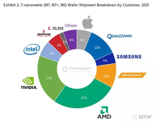 報告終強調(diào),2021 年7 納米制程的晶圓總出貨量將占全球12 吋晶圓的11%。在此情況下,智能手機將只消耗35% 的7 納米制程晶圓,另外大部分的7 納米制程晶圓將被AMD 和NVIDIA等廠商的CPU 或GPU 所消耗。整體來說,AMD 將消耗27% 的7 納米制程晶圓數(shù)量而排名市場[敏感詞],其次是NVIDIA 的21% 消耗比例。至于排名第三的則是高通,占比為12%,排名第四的則是聯(lián)發(fā)科,占比為10%。第五輪到英特爾,占比為7%。而緊隨其后的則是蘋果的占比6%、博通占比6%、三星占比5%、以及賽靈思的占比2%。