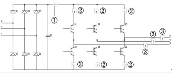 圖4中②用于檢測(cè)兩橋臂的中的電流差,由于換相失敗很容易使一相中上下兩橋臂中的IBGT模塊因過流而損壞,此時(shí)要求短路電流保護(hù)在短路檢出后10us內(nèi)切斷門驅(qū)動(dòng)電路,這種逆變器必須采用快速過電流保護(hù)裝置,可以用霍爾電流傳感器檢測(cè)每個(gè)橋臂中的電流,若因換相失敗造成上下橋臂同時(shí)導(dǎo)電,則相應(yīng)的兩個(gè)傳感器同時(shí)檢出電流信號(hào),經(jīng)與基準(zhǔn)電壓比較轉(zhuǎn)換成方波后,通過門電路控制封鎖所有的逆變觸發(fā)脈沖,切斷短路途徑,保護(hù)昂貴的IBGT模塊;