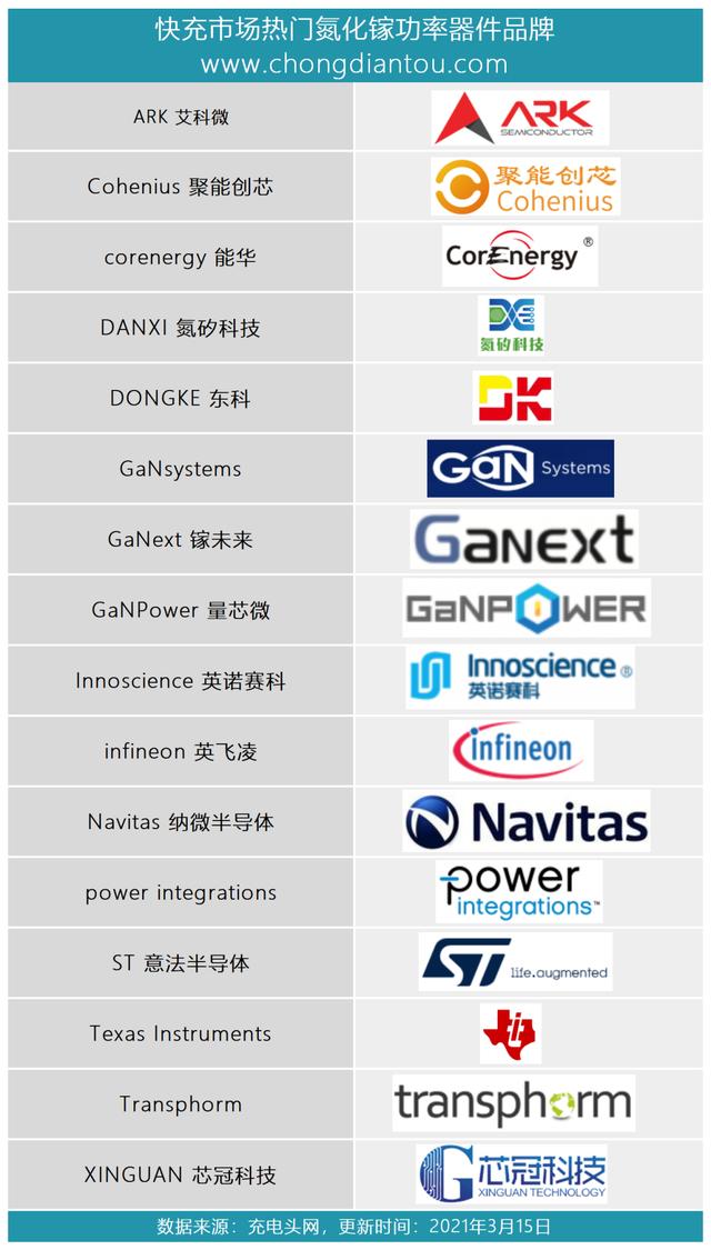 面對(duì)日益增長(zhǎng)的快充市場(chǎng),全球范圍內(nèi)已有納微、PI、英諾賽科、英飛凌、意法半導(dǎo)體、Texas Instruments、GaNsystems、艾科微、聚能創(chuàng)芯、東科半導(dǎo)體、氮矽科技、鎵未來(lái)、量芯微、Transphorm、能華、芯冠科技等16家氮化鎵功率芯片供應(yīng)商。