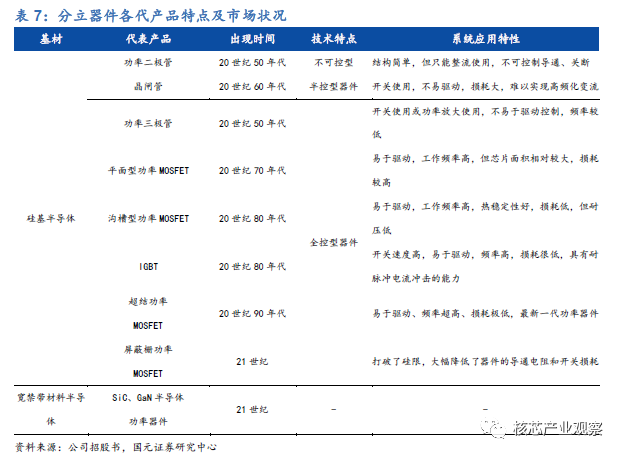 分立器件技術(shù)發(fā)展受下游需求驅(qū)動(dòng),從性能、結(jié)構(gòu)、材料等方面改良迭代以應(yīng)對(duì)更廣的應(yīng)用場(chǎng)景。早期二極管、三極管主要應(yīng)用于工業(yè)和電力系統(tǒng);晶閘管實(shí)現(xiàn)可控性改良;功率MOSFET和IGBT等器件實(shí)現(xiàn)高頻率、低損耗性能大幅提升;超結(jié)MOSFET打破傳統(tǒng)“硅限”以滿足大功率和高頻化的應(yīng)用需求;在硅基器件逐漸開(kāi)發(fā)到極限,開(kāi)始使用第三代半導(dǎo)體材料SiC、GaN替代硅材。