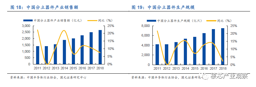 半導(dǎo)體分立器件是電力電子產(chǎn)品的基礎(chǔ)與核心器件之一,我國(guó)分立器件市場(chǎng)規(guī)模達(dá)2700億元。據(jù)國(guó)家統(tǒng)計(jì)局?jǐn)?shù)據(jù)顯示,近幾年分立器件行業(yè)規(guī)模在半導(dǎo)體行業(yè)總規(guī)模占比維持在22%-25%之間。我國(guó)是全球最重要的半導(dǎo)體分立器件制造基地和[敏感詞]的市場(chǎng),據(jù)中國(guó)半導(dǎo)體行業(yè)協(xié)會(huì)數(shù)據(jù)顯示,2018年我國(guó)分立器件年銷售規(guī)模達(dá)2,660億元,較2017年同比+7.50%,同期國(guó)內(nèi)分立器件生產(chǎn)規(guī)模達(dá)7471億只。