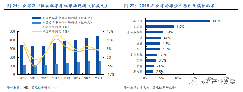 國(guó)內(nèi)功率半導(dǎo)體市場(chǎng)規(guī)模達(dá)千億元,全球前十企業(yè)被海外巨頭壟斷。目前根據(jù)IHSMarkit數(shù)據(jù)統(tǒng)計(jì),2018年全球功率器件市場(chǎng)規(guī)模約為391億美元,預(yù)計(jì)至2021年增長(zhǎng)至441億美元。目前國(guó)內(nèi)功率半導(dǎo)體產(chǎn)業(yè)鏈正在日趨完善,中國(guó)作為全球[敏感詞]的功率半導(dǎo)體消費(fèi)國(guó),2018年市場(chǎng)需求規(guī)模達(dá)到138億美元,占全球需求比例達(dá)35%,2021年市場(chǎng)規(guī)模有望達(dá)到159億美元。