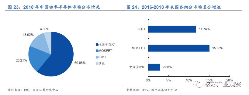 中國(guó)功率半導(dǎo)體市場(chǎng)中前三大產(chǎn)品是電源管理IC、MOSFET和IGBT,分別占2018年中國(guó)功率半導(dǎo)體總市場(chǎng)的60.98%、20.21%與13.92%。功率MOSFET和IGBT市場(chǎng)增速快,2016-2018年復(fù)合增速分別為15%和12%。