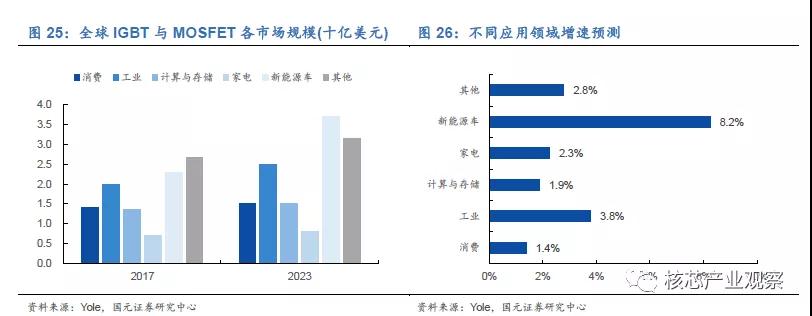 功率MOSFET和IGBT市場(chǎng)增速快,下游應(yīng)用中新能源汽車(chē)是主要驅(qū)動(dòng)力。根據(jù)Yole數(shù)據(jù)顯示,目前IGBT和MOSFET應(yīng)用最主要的兩個(gè)領(lǐng)域是新能源車(chē)和工業(yè),2023年預(yù)計(jì)新能源車(chē)領(lǐng)域市場(chǎng)空間達(dá)37億美元,工業(yè)領(lǐng)域達(dá)25億美元。得益于工業(yè)自動(dòng)化中伺服電機(jī)變頻器,可再生能源光伏逆變器和風(fēng)電變流器,以及電動(dòng)汽車(chē)電動(dòng)機(jī)用逆變器及充電樁相關(guān)設(shè)施的蓬勃發(fā)展,汽車(chē)和工業(yè)市場(chǎng)將成為功率半導(dǎo)體行業(yè)增速最快的兩個(gè)領(lǐng)域,年復(fù)合增長(zhǎng)率將達(dá)到8.2%和3.8%。