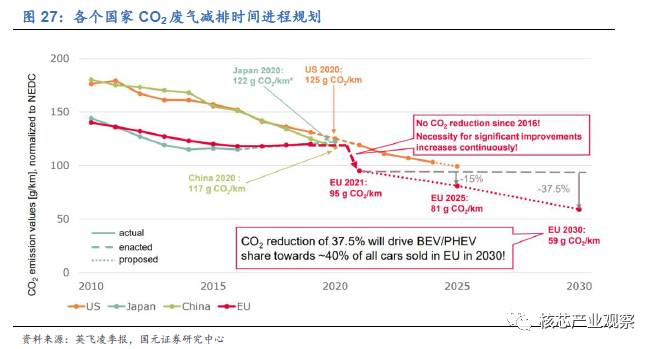 傳統(tǒng)汽車(chē)向新能源轉(zhuǎn)型為功率半導(dǎo)體行業(yè)發(fā)展賦能,新能源車(chē)市場(chǎng)前期靠政策驅(qū)動(dòng),后期靠市場(chǎng)價(jià)格驅(qū)動(dòng)。主要先進(jìn)國(guó)家在汽車(chē)CO2廢氣排放量訂立減排時(shí)間計(jì)劃,加速推進(jìn)電動(dòng)車(chē)發(fā)展。歐盟預(yù)期在2030年前CO2排量在減少37.5%,主要汽車(chē)大國(guó)皆有草擬停止銷售內(nèi)燃機(jī)汽車(chē)的相關(guān)計(jì)劃。未來(lái)10年各地區(qū)在政策強(qiáng)制驅(qū)動(dòng)+市場(chǎng)接力驅(qū)動(dòng)會(huì)逐步取代掉一部分傳統(tǒng)汽車(chē)市場(chǎng)份額。