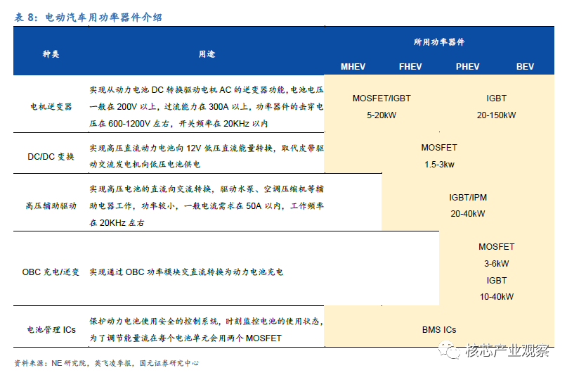 整車(chē)電動(dòng)化趨勢(shì)+電動(dòng)車(chē)市場(chǎng)滲透率增大驅(qū)動(dòng)車(chē)用功率半導(dǎo)體市場(chǎng)需求高速增長(zhǎng)。隨著汽車(chē)電氣化程度逐步提高,從微混型僅用于啟停功能,到全電動(dòng)車(chē)所需能量回收及車(chē)載充電,對(duì)功率器件需求量增大。電動(dòng)車(chē)用功率半導(dǎo)體器件主要有電機(jī)逆變器、DC/DC變換、輔助驅(qū)動(dòng)、OBC充電逆變和車(chē)用電池管理ICs。