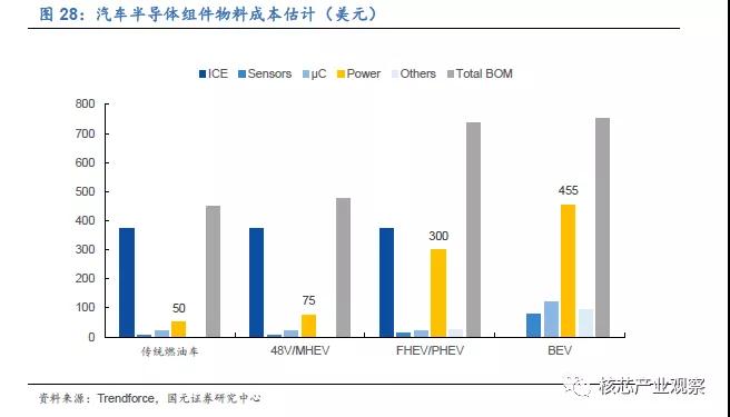 將汽車(chē)按燃油車(chē)、插電混動(dòng)車(chē)和純電動(dòng)車(chē)歸類,對(duì)比物料成本占比,由于插電和純電車(chē)引入電力系統(tǒng)作為動(dòng)力源,電控系統(tǒng)成本占比大幅度提升。傳統(tǒng)燃油車(chē)功率組件用量大概為50美元/輛,電動(dòng)車(chē)根據(jù)車(chē)型劃分功率組件用量從48V輕混75美元/輛增至純電動(dòng)車(chē)455美元/輛。